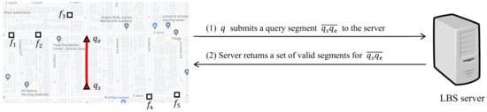 Interaction between the moving query point q and location-based service (LBS) server while q moves along .