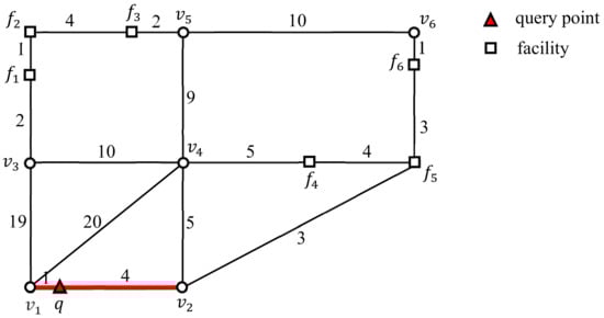 Road network and network distance [22,23,24,25,26]. A road network G is modeled as a weighted undirected graph , where V is a set of road intersections, E is a set of road segments, and W represents the distance matrix. The network distance between q and f, where q and f are two points on G, is the sum of the lengths of the road segments along the shortest path between q and f. The terms “network distance” and “length of the shortest path” are used interchangeably.