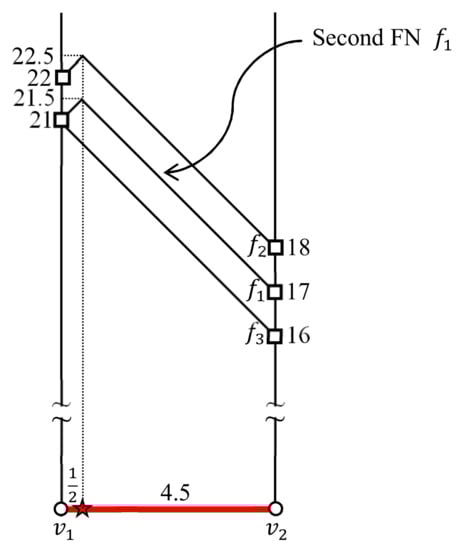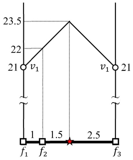 Figure 6 depicts the computation of . The distances from to endpoints and of are and , respectively, because the path from to () is (). Imagine a point f in . The distance from to f is then evaluated to because the path from to f should be or . Let . Accordingly, because . The distance from to f can be represented as for . As shown in Figure 6, the largest and smallest distances from to are evaluated as and , respectively. The star sign (★) in Figure 6 is used to signify .