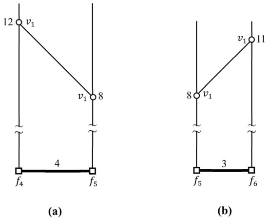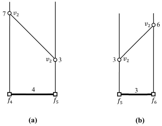Figure 7 illustrates the computation. Naturally, the largest distance between and is evaluated as . Figure 7a,b present the and computations, respectively. The distance from to () is () because the shortest path from to () is (). Imagine a point f in . The distance from to f is computed as ; therefore, the largest and smallest distances from to are calculated as and , respectively (Figure 7a). The same method in Figure 6 can be used to compute the largest and smallest distances from to (Figure 7b). The detailed procedure for the largest and smallest distance computation from to is omitted for simplicity. The shortest path from to () is (), and the distance from to () is (). Therefore, the largest and smallest distances between and are computed as and , respectively.