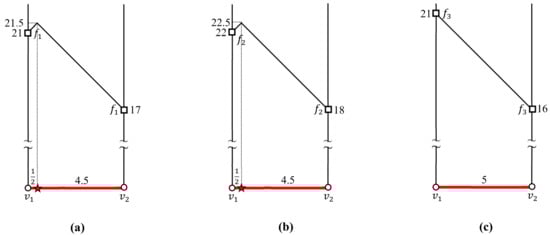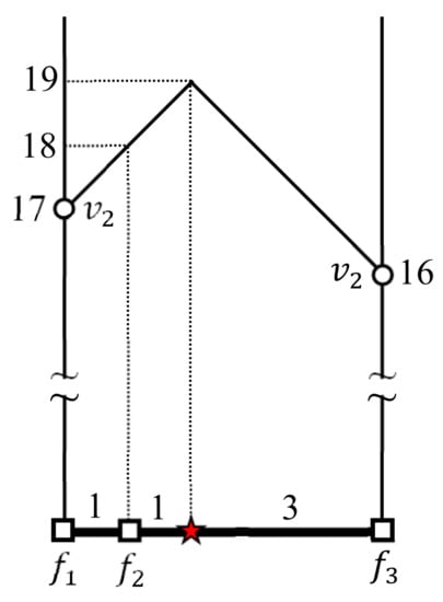 Figure 12 shows the changes in the distance from each candidate facility f to a query point q in , where . The distance from to () is (). Figure 12a demonstrates the change in the distance from to q in . The shortest path from to q in is either or . The distance from to q is evaluated as , where . Similarly, the change in the distance from to q in can be drawn (Figure 12b), where and . In the same manner, the change in the distance from to q in can also be drawn (Figure 12c), where and .
