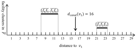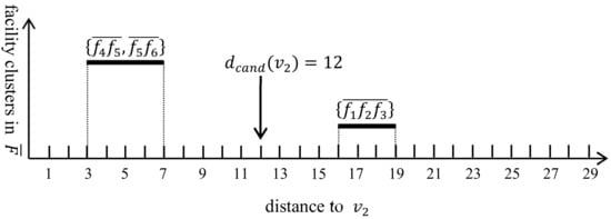 In the same manner, the kFN query is evaluated at to find the candidate facilities for the query segment . The largest distances between and the facility clusters in are calculated. The facility clusters are then arranged in a descending order based on . Figure 11 shows that the facility clusters and are sorted using their largest distance to as follows: . is investigated, followed by . After exploring , chooses , , and as the candidate facilities for the query segment because the distance from to the second FN is 17, and the candidate distance for is . The distances from to , , and are , , and , respectively (Figure 8). The other facility cluster does not have to be explored because is larger than (Figure 11). Finally, a set of candidate facilities at is evaluated as .