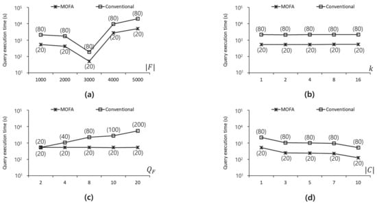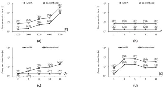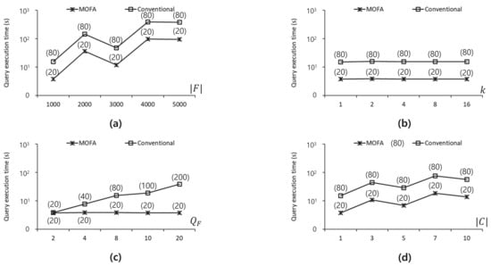 Figure 14 compares the proposed MOFA and conventional algorithm on the SJ road network. Each chart presents the MkFN execution time and number of kFN queries required to answer the MkFN query. The numbers in parentheses in Figure 14, Figure 15 and Figure 16 refer to the number of kFN queries required by MOFA and the conventional algorithm for answering the MkFN query. MOFA requires only two kFN queries to be evaluated to compute the valid segments for the query segment. However, the conventional algorithm requires kFN queries to be regularly evaluated to refresh the query results as the query point moves. In other words, the conventional algorithm evaluates a number of kFN queries linearly proportional to the query frequency, whereas MOFA evaluates only two kFN queries, regardless of the query frequency, as the query point moves within a query segment. Figure 14a presents the query execution times of MOFA and the conventional algorithm when the number of facilities varies from 1000 to 5000 (i.e., ). In all cases of , MOFA outperforms the conventional algorithm. For this empirical study, 10 query points were considered with each query point evaluating eight kFN queries while moving along its query segment. Therefore, the MOFA and conventional algorithms evaluated 20 and 80 kFN queries, respectively. Figure 14b presents the query execution times when the number of FNs required varies from 1 to 16 (i.e., ). For all cases of k, MOFA is approximately four times faster than the conventional algorithm. The query execution times of MOFA and the conventional algorithms are stable, regardless of k. This is because kFN query evaluation sorts facility clusters based on their distances to the query point and processes the sorted facility clusters. Figure 14c presents the query execution times when the query frequency varies from 2 to 20 (i.e., ). The query execution time of MOFA is stable and independent of the query frequency, whereas that of the conventional algorithm increases with the query frequency. Figure 14d presents the query execution times when the number of centroids for the facilities in F varies from 1 to 10 (i.e., ). The kFN query execution time tends to increase with the value. This is because the facilities become more widely distributed as the value increases, resulting in an increase in query execution time.