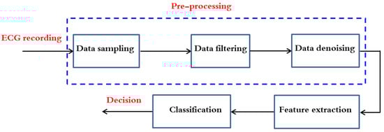 In this paper, a selection of works that attempt to solve the problem of detecting AF are presented. Most of them use a two-step procedure after ECG data pre-processing as shown in Figure 1: first, feature extraction from RR time series (tachogram) or P-wave or their combination is conducted and then followed by a classification building process based on the extracted parameters. The performance of the major established classification methods was evaluated on Physionet signals; a publicly accessible online database containing physiologic signals. Seven datasets are commonly used: MIT-BIH Arrhythmia Database (abbreviated MITDB or often MIT-BIH AR as well), MIT-BIH Atrial Fibrillation Database (AFDB), Long-Term AF database, Paroxysmal Atrial Fibrillation Prediction Challenge Database (ParAFDB), AF Termination Challenge Database (AFTermDB), MIT-BIH Normal Sinus Rhythm Database (NSRDB), and Normal Sinus Rhythm RR Interval Database (NSR2DB).