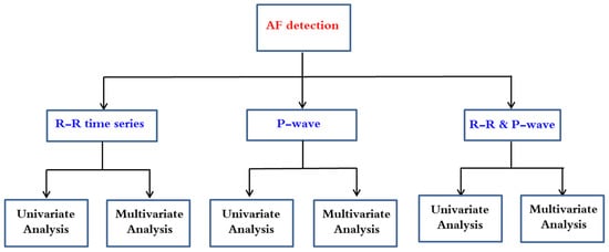After reviewing recent papers, we have noticed that the published works dealing with AF detection may be categorized in six methodologies as summarized in Figure 2.