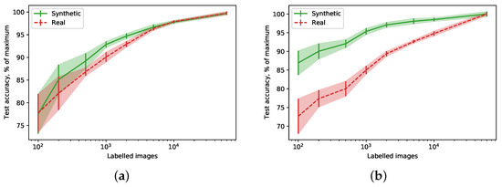 Figure 3. Relative accuracy (a percentage of maximum achievable accuracy) for different numbers of labelled images. (a) MNIST; (b) Fashion-MNIST.
