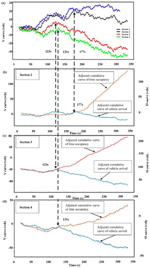Based on the construction method of the oblique cumulative curve of the appealing vehicle and combined with the research division of this area in this paper, the oblique cumulative curve of the critical sections (tunnel entrance and exit, slope change points, etc.), in the whole region of the tunnel is constructed. The oblique cumulative curves display “virtual departures,” such that the vertical displacements between any two are the excess vehicle accumulations (queueing) on the intervening tunnel segment. With the oblique coordinate system, each curve displays the quantity, the virtual vehicle counts to time, minus a background reduction. We conducted the adjustment tests for the background parameters of each section. The original parameter value is the average flow multiplied by the interval extending from the curves’ start time to the current time. Then, we tested the parameters varying from −10% to 10% of the original value for final use. After several adjustment tests, the background parameters of each section are determined to significantly enhance the visual effect of the flow rate change of sections.