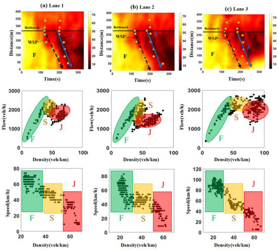 This section uses vehicle speed’s temporal and spatial characteristics as reference indicators, and the three main lanes’ temporal and spatial trajectory diagrams are homogeneously abstracted. We then draw the three-phase traffic flow temporal and spatial characteristics of the main lanes (see Figure 3). Kerner’s empirical research shows that there are usually two main blocking patterns at a single bottleneck: the synchronized flow pattern (phase S) and the wide moving jam pattern (phase J). In Kerner’s theory, the phases J and S in congested traffic are observed outcomes in universal spatial–temporal features of real traffic data. Asynchronous flow appears at the bottleneck at the beginning of the congestion and propagates upstream of the bottleneck. The downstream front of the synchronized flow is often fixed at a bottleneck. In contrast, a wide-moving jam could occur spontaneously in this synchronous flow. A wide moving jam is meant to reflect the characteristic feature of the jam to propagate through any other state of traffic flow and any bottleneck while maintaining the velocity of the downstream jam front. The speed within the wide moving jam could be very low, and thus this pattern is also called stop-and-go traffic.