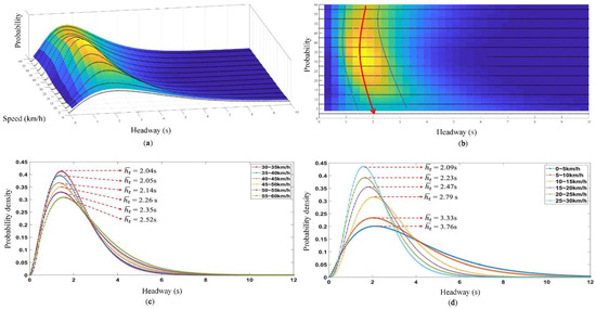 The headway indicates the time difference between the two vehicles passing through the same position on the road and represents the maximum reaction time of the driver behind the vehicle when the current vehicle brakes suddenly. The headway distance is closely related to the traffic flow composition and driving behavior and is an essential indicator of road capacity, service level, and driving safety. The probability distribution of headway is shown in Figure 4.