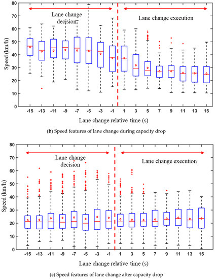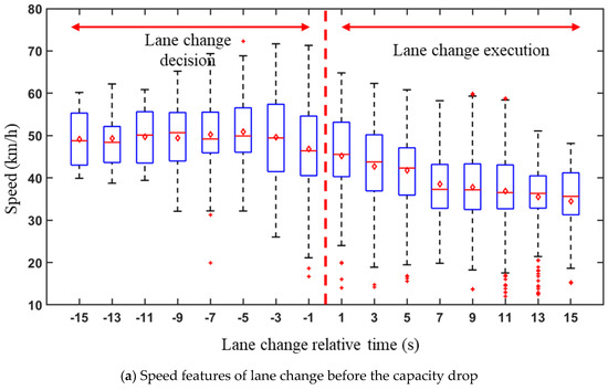 After the traffic capacity declines, the road shows more severe congestion, and lane-changing vehicles show a low-speed and stable trend. There are significant outliers in the speed box diagram at the lane-changing decision-making stage in this state. After inspection, these outliers are in the upstream input area or ramp, and the congestion state has not spread to this area.