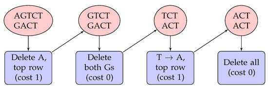 For example, in order to compute the Levenshtein distance from AGTCT to GACT, the A must be deleted and the first T switched to an A, for a cost of two. This eyeball calculation only works for simple examples, so Figure 1 illustrates this perspective on the classical Levenshtein algorithm.