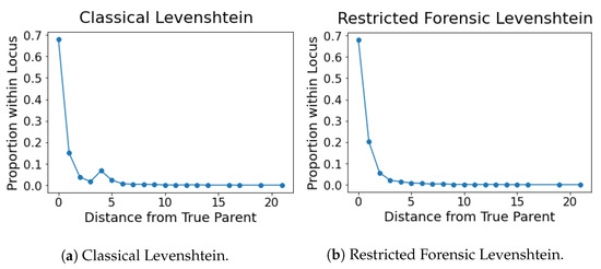 The proposed algorithm allows any prespecified set of motifs. For every additional motif, two inner for-loops are added at each step in the dynamic programming matrix to check the cost of inserting and deleting anywhere from 1 to characters from the dictionary associated with that motif of length . Because there are two for-loops running through the list of all motifs, and within each of them there is another for-loop running through 1 to characters for motif i, the algorithm grows in complexity by those factors. Where the classical Levenshtein distance is for strings of length and , the RFL distance theoretically requires time, where m is the number of motifs and k is the length of the largest motif , assuming dictionary lookup speed. However, in applications with standard autosomal STRs, motifs are all of length at most 5 (), so this algorithm can be considered as growing with the number of motifs considered as well as the lengths of the strings. Additionally, standard autosomal STRs have no more than a handful of motifs to be considered—a maximum of three, in this work—so the asymptotic growth becomes once more.