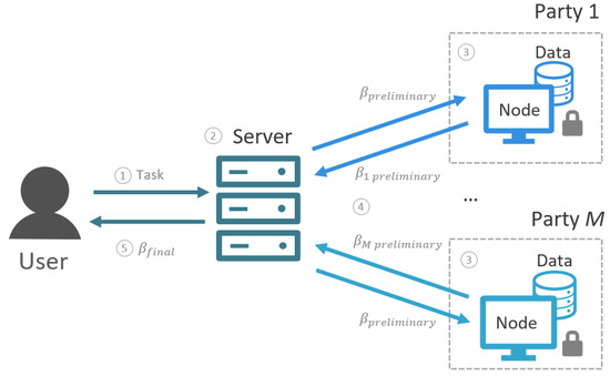 Our presented federated GLM algorithm is designed to run on a server–client architecture [6], as shown in Figure 1. In this scenario, (1) the user sends a task (i.e., the instruction to run a specific algorithm) to the server. When received, (2) the server manages and synchronizes the execution of the algorithm across all nodes (i.e., parties). In short, (3) each node accesses its own local data and executes the requested algorithm with the given parameters. Afterwards, the node outputs a set of intermediate results (often in the form of preliminary coefficients), which are sent back to the server. Then, using these, (4) the server computes a first version of the global solution and sends it back to the nodes, which use it to compute a new set of results. This process is repeated iteratively until (5) the global solution converges or after a fixed number of iterations, yielding the final version of the (federated) model.