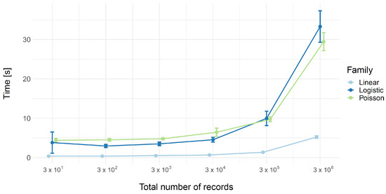 Execution time for the different families (linear, Poisson, logistic) of the GLM. In this case, the number of parties was kept constant (at 3), while the total number of records went from 30 to 3,000,000 with increasing order of magnitude. Thus, the scale of the x-axis is logarithmic. Each scenario was simulated 100 times. Data points represent the mean of the execution time, while error bars represent ±1 standard deviation. The lines of each family were slightly shifted along the x-axis to avoid overlap between them.