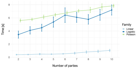Execution time for the different families (linear, Poisson, logistic) of the GLM. In this case, the number of records was kept constant (at 10,000), while the number of parties was 2, 3, …, 10. Each scenario was simulated 100 times. Data points represent the mean of the execution time, while error bars represent ±1 standard deviation. The lines of each family were slightly shifted along the x-axis to avoid overlap between them.