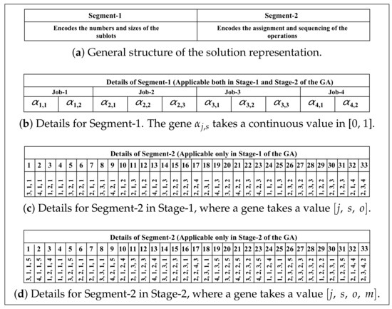 A solution encoding is a technique of transforming a problem statement into a searchable space of all feasible solutions, in which an algorithm can be applied to explore iteratively for optimal solutions. Hence, its design is the first most crucial step in solving a problem using a search-based algorithm. The solution encoding used in this paper combines features from the solution representations in [2] for FJSP lot streaming and that in [1] for dividing the genetic search into two stages. This solution encoding is depicted in Figure 1 for a typical solution of the prototype problem presented in the previous section.