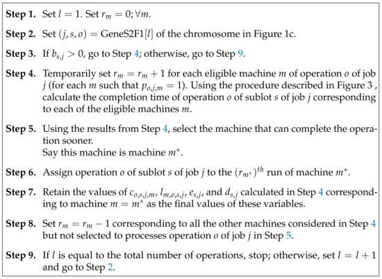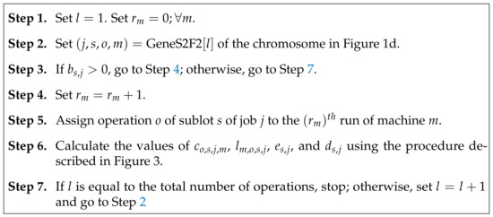 The flowtime of sublot s of job j, denoted as , is the interval between the time the sublot enters the shop floor to the time its last operation is finished. Its value is set by the constraint in Equation (27). The constraint in Equation (28) along with the objective function will enforce to assume the maximum flowtime of all the sublots (). The total flowtime of all the sublots is calculated by the constraint in Equation (29). The objective function terms and are the values of and as shown in Equations (30) and (31), respectively. The minimization of flowtime can lead to stable or uniform utilization of resources and a rapid turn-around of jobs, and it is particularly important in real-life situations where reducing inventory or holding cost is of primary concern [42].