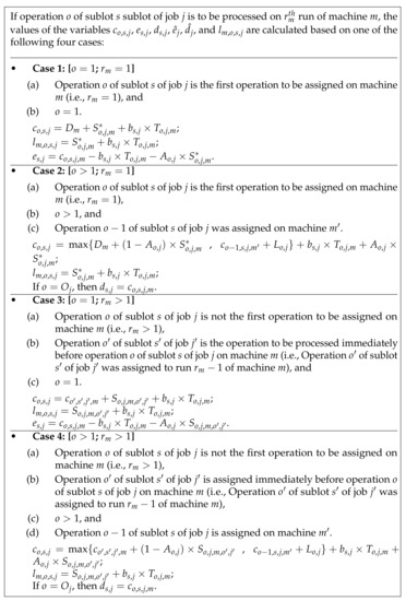 The workload on machine m (i.e., ) because of an assigned operation o of sublot s of job j comprises the setup and the actual processing of the operation. The value of this variable is assigned by the constraints in Equations (45)–(48). The overall workload on machine m, (), comprises the workloads because of all the operations assigned to it from the current schedule and its release date as shown in Equation (49). The release date may represent the amount of work that spills into the current planning and scheduling period from the previous one.