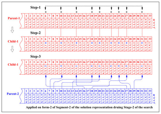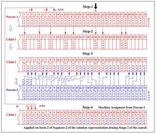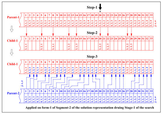 To illustrate the solution representation and the various genetic operators, a prototype problem that consists of the processing of four jobs using five machines is considered. The complete data sets for this small problem are given in Table 1 and Table 2. Data related to batch size (), the nature of setup being attached or detached (), lag-time () and alternative routing () for each operation are in Table 1. Sequence-dependent setup time data is provided in Table 2. This problem is also used in the numerical example to illustrate the various objective function terms of the proposed model.