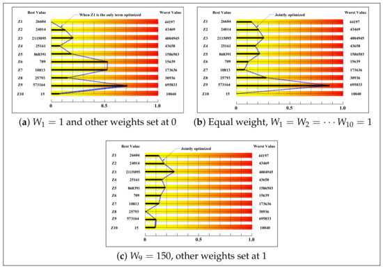 The objective of the proposed multi-objective model is to minimize the function given in Equation (20) subject to the constraints in the original model in Equations (2)–(19) and newly added constraints in Equations (21)–(56). The objective function terms and the additional constraints are discussed in the following sections.