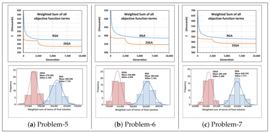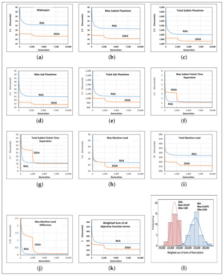In this study, we used a total of 80 concurrently available CPUs in high performance parallel computing platform to implement the parallel RGA (P-RGA) and the parallel 2SGA (P-2SGA). Problems 4, 5, 6, and 7 were solved using both the sequential and the parallel versions of these algorithms using a subpopulation size of 2000. The subpopulations were allowed to communicate every 30 generations. The change of stage for 2SGA occurred at 2500 generations. The computation was terminated after 10,000 generations. The resulting convergence graphs are given in Figure 15. From these graphs, one can see that parallelization brings performance improvements in both RGA and 2SGA. However, the crucial finding in this investigation is that the sequential 2SGA using a single CPU outperforms the parallel RGA that uses 80 CPUs. This finding asserts the superiority of 2SGA over RGA in solving the proposed multi-objective FJSP lot streaming problem.
