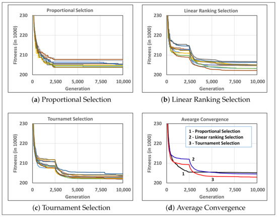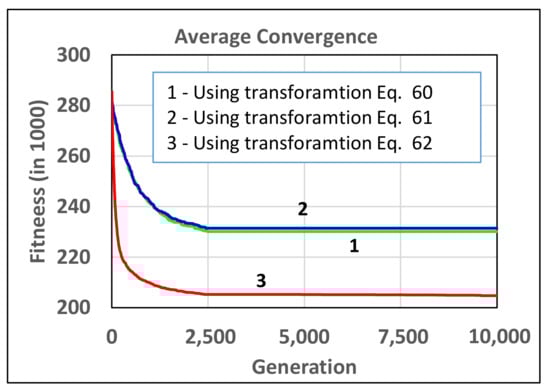 In this section, we present comparative empirical studies on the various selection operators presented in Section 4.5. The comparisons are presented in terms of the convergence behavior of 2SGA in solving Problem 4, whereas similar results were obtained in solving several other problems. The first of these imperial studies is aimed at comparing the three fitness transformation functions in Equations (60)–(62) used in the proportional selection method. Figure 16 provides the average convergence from ten test runs using these three different fitness transformation equations. As can be seen from this figure, Equations (60) and (61) resulted in similar convergence behaviors of the algorithm. In contrast, the transformation function in Equation (62) resulted in a much better convergence of 2SGA when using the proportional selection method.