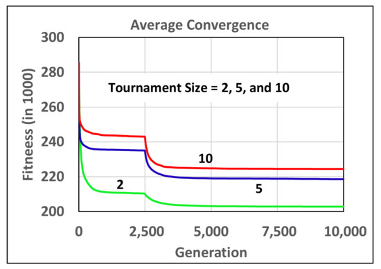 The second empirical study investigates the impact of tournament size in tournament selection. Figure 17 depicts the results of this study. This figure shows that tournament selection with a smaller tournament size was preferred in solving the proposed mathematical model using 2SGA. Lastly, a comparison of proportional, linear ranking, and tournament selection was conducted, and the resulting convergence graphs are given in Figure 18. This figure shows that the tournament selection resulted in an improved convergence of the proposed 2SGA. Hence, tournament selection with a small tournament size is the preferred selection operator in the proposed algorithm.