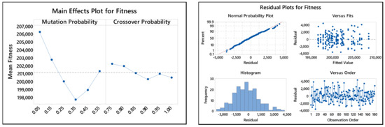 The plots of the main effects in Figure 19 show that the mutation probability needs to be set close to 0.35, and the crossover needs to be set at higher values between 0.90 and 1.00. The residual plots do not indicate unusual patterns, thus, confirming the adequacy of the ANOVA. The analysis also rendered similar results on several other problems of a varying size considered in this paper. Hence, the recommended values of the mutation and crossover probabilities can be used to solve different sets of problems using the proposed algorithm.