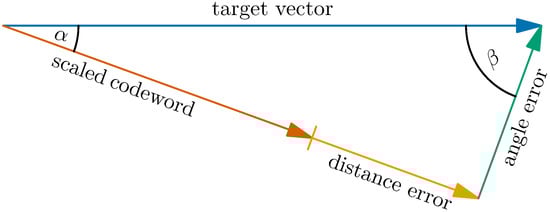 with . Like in Example 1, the number t is approximated by a weighted sum of powers of 2. However, the weighting coefficients are chosen from the set instead of . For the optimum set , the average mean-squared distortion is shown in Appendix A to be