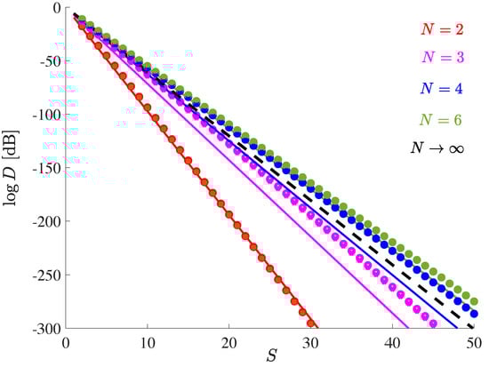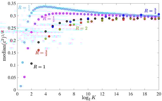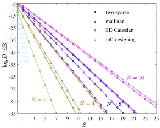This is a much more optimistic scaling than in Example 2. For scalar linear functions, Booth’s CSD representation made the mean-square error reduce by the constant factor of 28 per addition. Due to linear computation coding as proposed in this work, the factor 28 in (5) turns into , the squared matrix dimension, in (47). Since we have the free choice to go for either tall or wide submatrices, the relevant matrix dimension here is the maximum of the number of rows and columns.