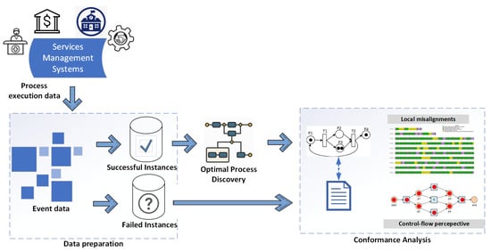 Process mining techniques enable organisations to gain insight into their processes by utilising the event data captured by services management systems. A process is a collection of discrete activities or events designed to achieve a particular business objective. Process mining techniques are focused on three main areas: (i) process discovery, dealing with the discovery of the process models based on the behaviour of events [], (ii) conformance analysis, identifying inconsistencies between actual process executions and behaviour of the process observed through the discovered process model [], and (iii) process enhancement, establishing a feedback mechanism for the improvement of the process model through the learning of conformance analysis. Once a process model is discovered, conformance checking apprehends the reality of synchronisation between the recorded logs and the discovered model. Customer-centric organisations are focused on using the collected data to measure the conformance of their business processes. This is one of the ways to make sure that their service level is up to the standards for customer satisfaction. We further explored the conformance checking techniques in this work to identify, spot on and classify the anomalies and their severity in the execution of the business process. Furthermore, customer-centric organisations use service management systems that interact with their customers and execute the business processes. This execution generates a large amount of data as events in the executing process are recorded by the system and these data are used for gauging the performance of the process. The recorded events may be logged at more than one information system, it is vital to first convert the raw process data recorded by heterogeneous systems in the form of an event log, which enables data to be used for process mining.