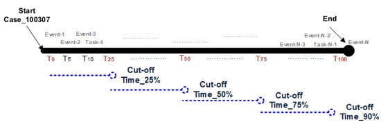 Successful and failed cases are segmented into several sub-logs based upon the time-based threshold presenting the duration of cases since the start of execution. The threshold is a cut-off time that refers to the duration of the process’s portion used as an ‘active phase’ of the case for future outcome prediction. In the rest of the section, the cut-off time (25%, 50%, 75% and 90%) is expressed as time thresholds, calculated as Equation (1).