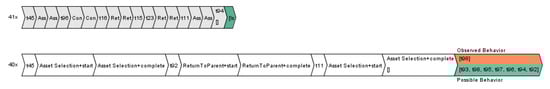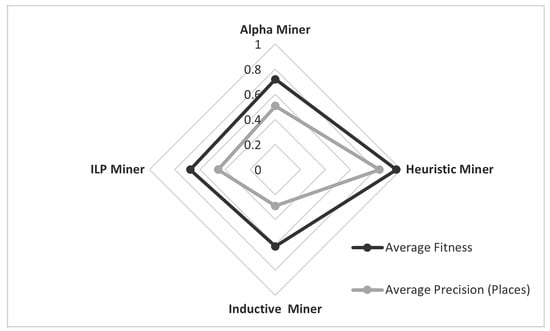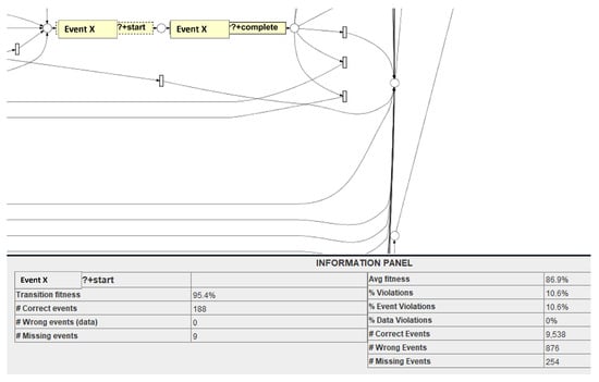 In Equation (2), presents the considered trace of the process log for replaying the log into the process model, and presents the Petri net model discovered through a miner algorithm. The number of missing tokens m, number of consumed tokens c, number of remaining tokens r and number of produced tokens p are all associated with the log . The first part represents the proportion of missing tokens relative to the number of tokens consumed. The second part calculates the remaining token fraction relative to the total tokens generated through the log. The closer the value of fitness f to 1, the higher the fitness of the model and the better the conformance related to the considered event log. Fitness is the most vital metric for gauging the quality of the process model [].
