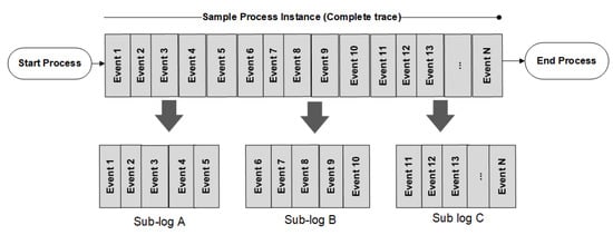 This section presents the steps to create checkpoints in the executing instances. Several techniques can be used to divide the complete trace of the process into several segments. The technique used by Khan et al. in [] used the percentage of the time spent from the starting date and time of the process until target date and time , where is an initial target for the process to be completed, as defined at the start of the process. Another technique is to create checkpoints based on the fixed duration checkpoints for the executing process instance. However, both of these techniques do not consider the domain knowledge of businesses. Process owners should be able to identify certain points in the process execution at which the identification of possible anomalies may be beneficial.