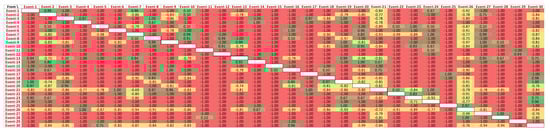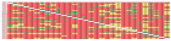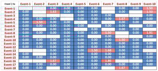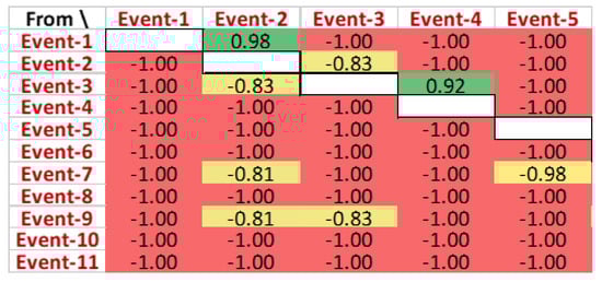 The dark blue colour presents that there is no difference between the direct relationship of events, whereas the colour ranging from white to red shows the difference in the causal relation ranging between 0.01 and 1.99. For instance, a dissimilarity of 1.99 is observed between ‘Event-8’ and ‘Event-12’. The reason for this divergence is that the former event never directly followed the later event in any of the successful cases but always followed in the failed cases.