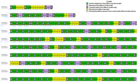 For each of the traces which are part of the event log with failed cases, the corresponding alignment is calculated over the Petri net discovered for the successful cases. In Figure 15, a coloured view of the log presents the alignment checking results generated through the ProM 6.10 tool. Each row represents a group of an end-to-end execution of similarly executed traces with events classes highlighted with a specific colour. The green colour represents the exact alignment of the event with the optimal process model, whereas log moves and model moves are highlighted with yellow and purple. Model moves (grey and purple) identify those events present in the log with successful cases; thus, this behaviour is replicated in the optimal process model.