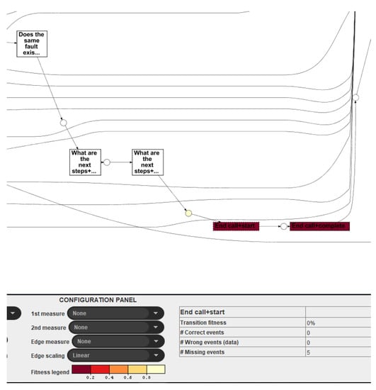 An event ‘End Call’ is a part of an optimal process model, but its transaction fitness is 0%, which means that no instance of the failed event log traversed this portion of the model. This information is useful when considering deep investigation for the abnormality analysis.