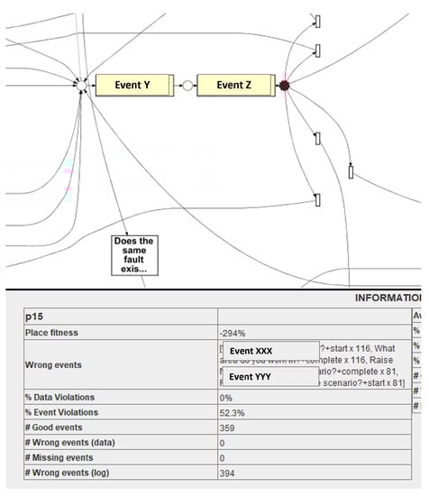 In CDP, the average fitness of the log is 96.4, as shown in Table 4. The next step is to further explore all of the event classes where event-level fitness is less than 96.4. In Figure 18, an event class ‘Event-Y’ has a place fitness of 94.3%, thus place level analysis is performed. It is identified that at place p15, the event violation is 52.3%. This means that for each 52 out of 100 cases, misalignment is observed. A total of 394 wrong events are identified at p15, and details of these wrong events are also determined to be presented to the business users. At p15, the event ‘XXX’ is observed 232 times and ‘YYY’ is monitored 162 times. A behavioural deviation in failed cases, along with the information about its placement, is essential for business users to rectify of these deviations.