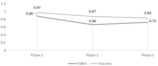 In Figure 19, the average fitness scores of successful cases with the failed cases are compared for all the instances belonging to an individual sub log. It can be seen that there is an apparent difference between fitness scores for events at the very start of the process execution. Successful cases had a fitness score of 0.97 compared to 0.88 for the failed cases. This gap further opened up when the process was almost halfway completed. At 50% of the process execution, the overall fitness of the failed cases had a steep degradation. The average fitness score of the failed cases is around 20% less than the score of successful cases. The fitness gap again shrinks back to around 10% near the end of the process. Successful cases present an average fitness score of 83% with a score of 72% for failed cases.