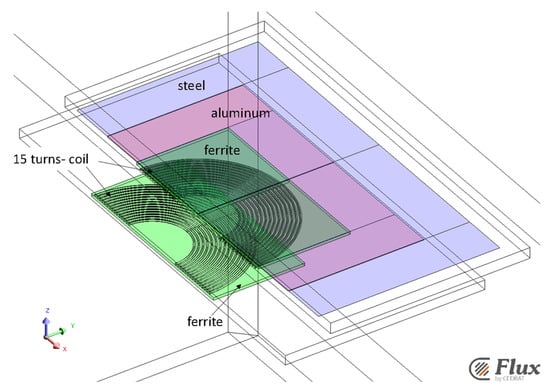 Besides the coils, the proposed model encompasses the bottom of the car frame and the magnetic shielding system, i.e., ferrite yokes and an aluminum plate. The transmitting coil is supplied by a current at 85 kHz, as prescribed by the SAE standard []. The simulated device corresponds to a laboratory prototype and was sized to transfer a power of 600 W to charge a minicar battery []. At nominal condition, the current in the transmitting coil is 5.7 A and the corresponding voltage induced across the receiving coil is approximately 90 V.