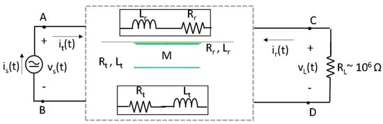 To evaluate the lumped parameters of the system, the 3D model of the device has been coupled with an electric circuit that includes a perfect current source and a resistive load, whose resistance may be varied, from the actual value of the load connected to the receiving coil to a very high value to simulate an open circuit (Figure 2) [,].