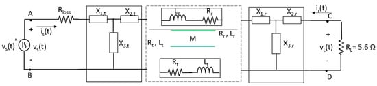 CNs operate on the basis of the resonance phenomenon to achieve a minimum of the reactance seen at the inverter output in correspondence with the nominal supply frequency, ω0. This condition helps to minimize the voltage needed to supply the transmitting side CN-coil assembly and forces the inverter output current to be nearly sinusoidal despite the quasi-square waveform of the output voltage. From this condition, it is derived that the analysis of WPTSs can be performed by hypothesizing that all the involved electrical quantities are sinusoidal at 85 kHz. According to this hypothesis, the circuit of Figure 3 can be redrawn in the scheme of Figure 4, where phasor quantities are considered. Subscripts t and r indicate the receiving and transmitting coils, respectively.