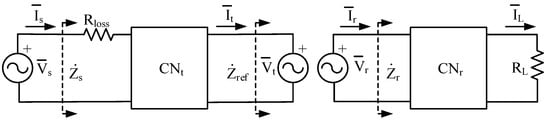 The transferred power, , depends on the values of the reactances forming CNr and on RL, whose values must be known in order to evaluate power and efficiency. To this aim, we can introduce the reflected impedance, , that is a function of , M, and the supply angular frequency, ω, but that does not depend on the topology of the CNs:
