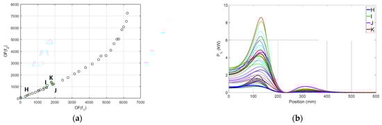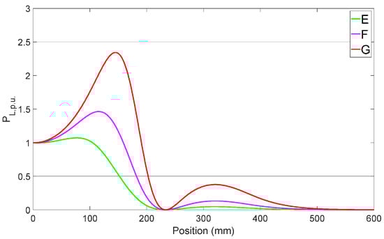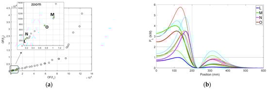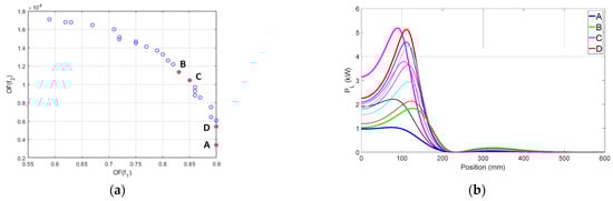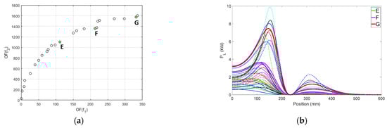 The Pareto front of Problem 2 is represented in Figure 8a. In this case, the OFs (13), to be maximized, and (14), to be minimized, are used and, among the whole 75 optimized individuals, 36 individuals satisfy the three conditions stated in Section 3.1. Their power vs. position and per unit power vs position profiles are reported in Figure 8b and Figure 9. Two individuals whose per unit power profiles are similar to those of A and B are selected and are denoted as E and F. As a matter of fact, the power, PL(0), transferred using individuals E and F is roughly twice the power relevant to A and B, respectively. The individual E gives nearly the same PL,p.u.,max and xpmax as the individual A, while F originates a lower PL,p.u.,max than B but with a shorter xpmax.