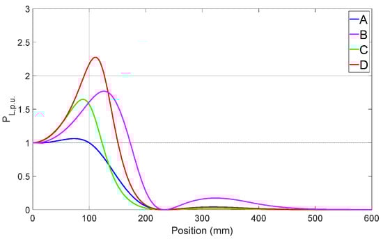 Considering the original requirement of transferring a power of 600 W, the individuals that originate the power profiles denoted with “A” and “B” are the most promising. The first one allows to transfer a power of approximately 0.97 kW that is quite constant without the need of adjusting the supply voltage from the aligned position to the maximum position, xpmax, of 100 mm. The second individual enlarges the range where it is possible to transfer the power, PL(0), up to xpmax = 173 mm and limits the maximum transferred power to 1.76 times PL(0). This latter characteristic is highlighted in Figure 6, where PL,p.u. is plotted as a function of the position itself. The figure reports only the profiles relevant to the individuals A, B, C, and D in order to make its analysis easier.