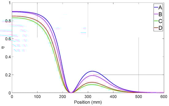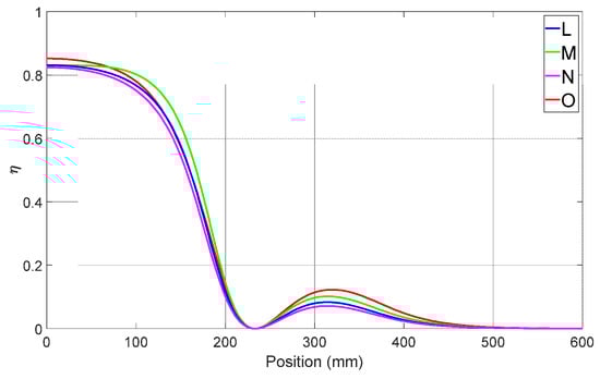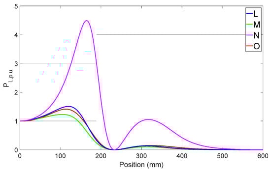 The pmax of the individual denoted with “N” is the longest among the total of the individuals resulting from the optimization process and results of 207 mm. This performance is obtained at the expense of a very high PL,p.u.,max, which reaches 4.48, and of a profile of efficiency that lies under the others for any position.