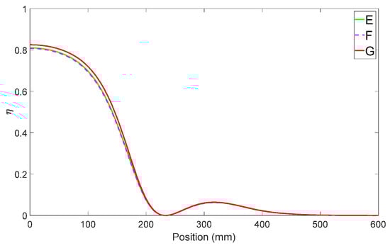 Considering the individuals with the highest power transferred, the one marked with “G” gives the most balanced performance because its relevant PL(0) and xpmax are very near to the highest among the 36 selected individuals and PL,p.u.,max is sensibly lower than the maximum. Considering the power profiles, individual G outperforms D, but unfortunately it originates an efficiency about 3% lower, as can be seen in Figure 10, which plots the efficiency profiles of G, E, and F, and in Table 3. All the analyzed individuals in terms of power profile are marked with green dots in Figure 8a.