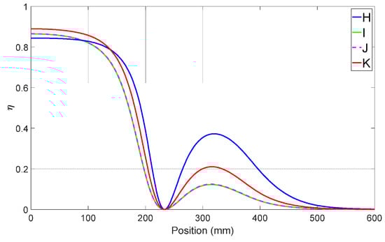 From the point of view of efficiency in the aligned position, individual K is the best: it is slightly overperformed only by individual A, but transfers more than twice its power. This result regarding efficiency can be explained considering that in the power transfer efficiency computation the losses of the CNs capacitors are neglected as they are considered much lower than the losses in the inductors. Consequently, the individuals H, I, J, and K, which do not have inductors on the receiving side, give higher efficiency than the individuals E, F, and G considered in Section 3.3. As shown in Figure 13, the efficiency profiles of I and J are practically equal. Individuals K and H give, respectively, the highest and the lowest efficiency in the aligned position and K exhibit a higher xpmax than H; however, when the coil misalignment exceeds 138 mm, the efficiency of H becomes the highest among the considered individuals, being 10% higher than that of K. All the analyzed individuals in terms of power profile are marked with green dots in Figure 11a. The power profile characteristics and the reactances relevant to individuals H, I, J, and K are listed in Table 3 and Table 4.