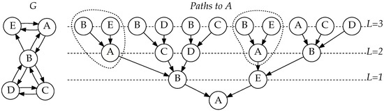 Network G, and a tree of all paths ending at node A in network G, with length at most 3, illustrating how paths are combined at their last common node. [15].