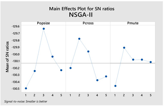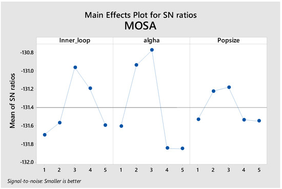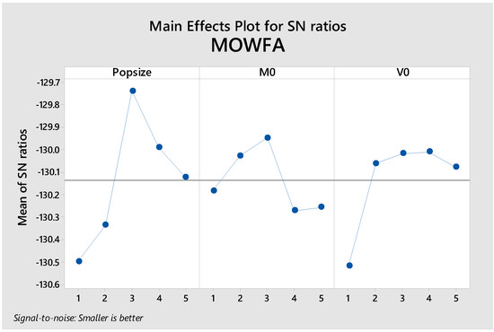 The number of required experiments for the factors above equals . However, regarding time and cost, this kind of experiment is not affordable. Accordingly, we get help from fractional iteration plans. In this problem, the freedom degree is set to 1 for the total average and 4 for each five level factors. Therefore, the total of freedom degrees equals . Thus, we have to select an array with at least 13 rows, and the L25 orthogonal array meets this requirement. The designed array structure and experiment results for NSGA-II, MOSA, and MOWFA are presented in Table 5. MID is considered a response variable. Each experiment is repeated three times and MID values are considered a basis for experimental results. Figure 2 demonstrates how the S/N criterion values are changed for different algorithm levels. The levels in which the S/N criterion has reached its maximum are optimum levels. It represents the MOWFA algorithm, and the best level of population size is its third level. Therefore, the appropriate population size for MOWFA is 30. The optimum levels of two other factors of MOWFA are also evaluated in the domain and for the M0 factor, the third, and for V0 the fourth levels are chosen. Figure 3 demonstrates the related results to the MOSA algorithm. The best level of population size is placed within the evaluated domain and is its third level. Therefore, the appropriate population size for MOWFA is 30. Thus, the appropriate population size for MOSA is 20. The optimum level of two other factors is also evaluated in the domain and for both factors i.e., for the inner loop and alpha, the third level is chosen. Figure 4 shows the related results to the NSGA-II algorithm. The best level of population size is placed within the evaluated domain and is its third level. Therefore, the appropriate population size for NSGA-II is 100. The optimum levels of two other factors of NSGA-II are also evaluated in the domain and for both Pcross Pmute factors the second levels are chosen. These real values are presented in Table 5.